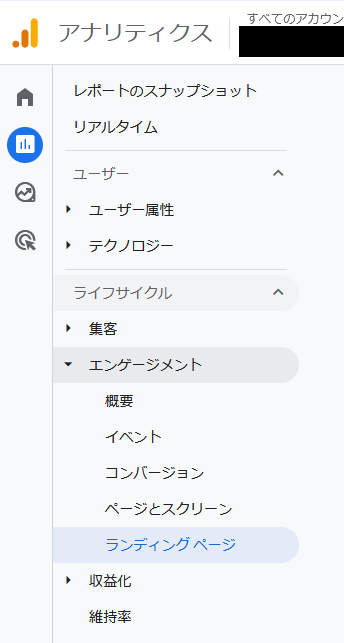 また、サイト内の「行動」「サイトコンテンツ」を選び、「ランディングページ」を選択すると、それぞれのページに関する数値が掲載されています。