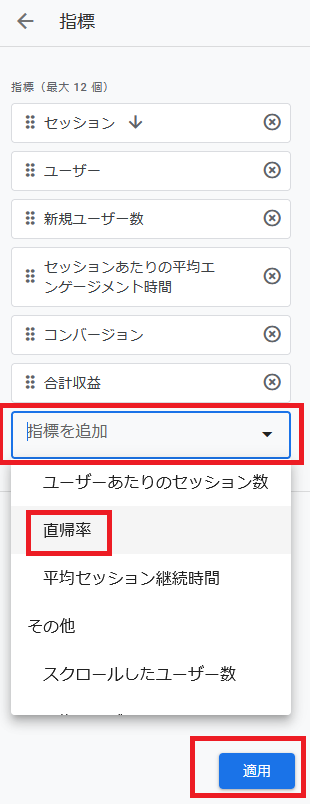 指標を追加から直帰率を選び、右下の適用ボタンをクリック